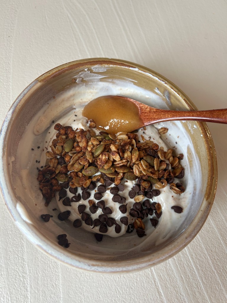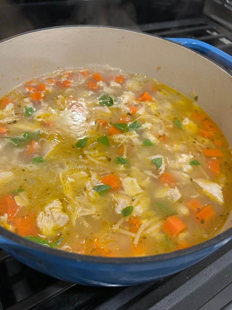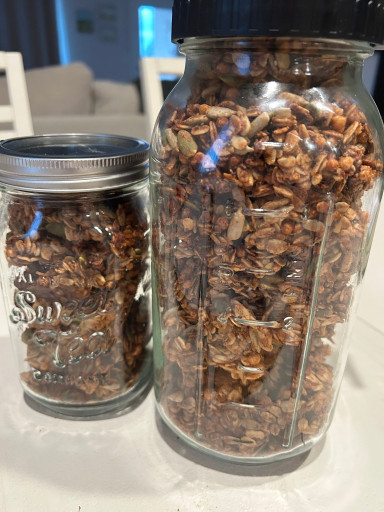 It’s 2pm on a Saturday and we’re on our way home from a birthday party. I didn’t have anything planned for dinner, but I was really wanting Chicken Noodle Soup. By now, we have already gone through our freezer stash of meals. This is a classic dish, known mainly to have while you’re sick. But why only then? This meal is packed with nourishing ingredients that provide healing. The hot broth keeps you hydrated and contains electrolytes. Chicken provides protein which supports healing and immune function, while the vegetables add vitamins and minerals. Beyond those benefits, it’s a comfort meal–familiar and soothing, which can make you feel cared for. Once home, I got the crockpot out to cook the chicken (I only had frozen on hand). While the chicken was cooking, I decided to make granola. I’ve been wanting to make some for a while because I can never find exactly what I want at the grocery store.