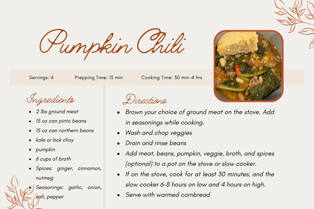 I want to share some of the yummy bites I cooked during the month of September. A few recipes I have shared in previous posts, but this one will feature the recipe for Pumpkin Chili–perfect for fall.