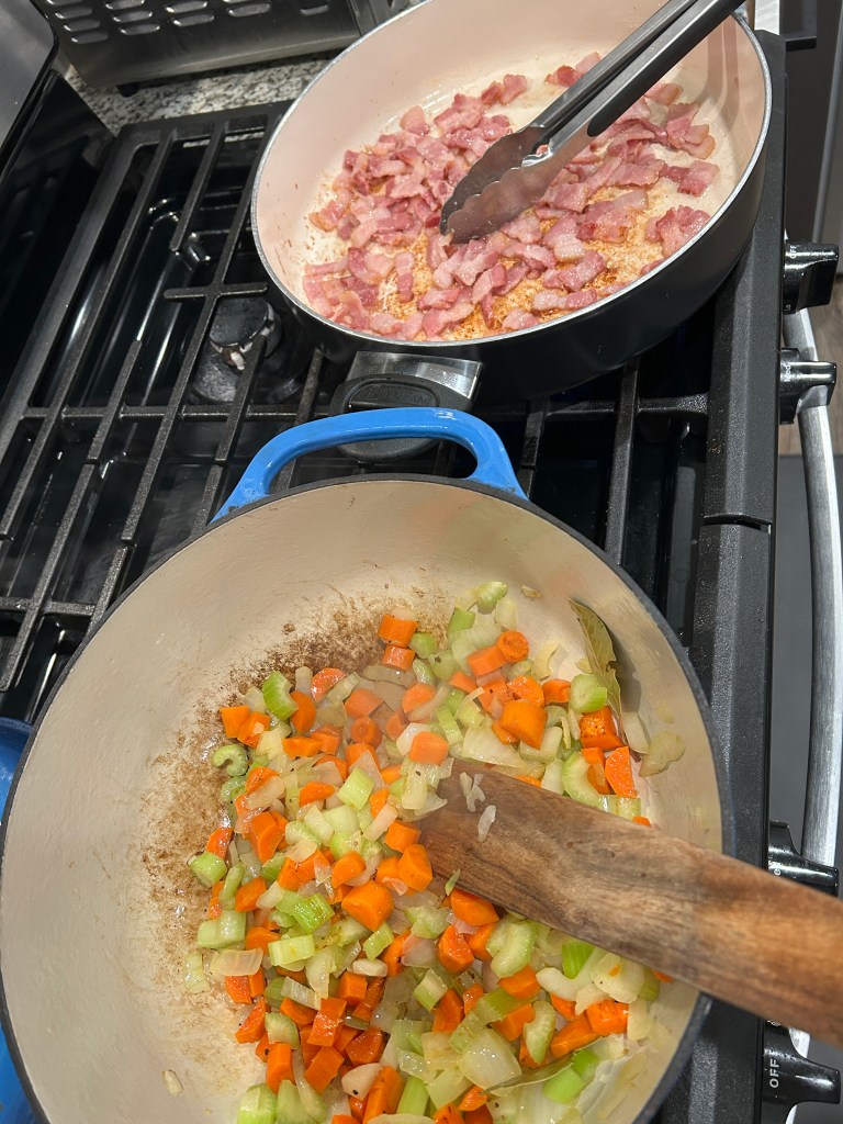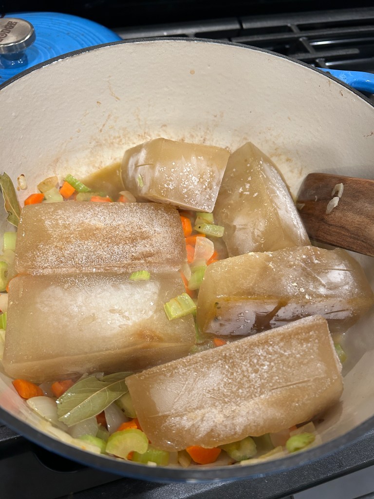 Bay leaves were added once the aromatics were softened. 6 cups of homemade broth.