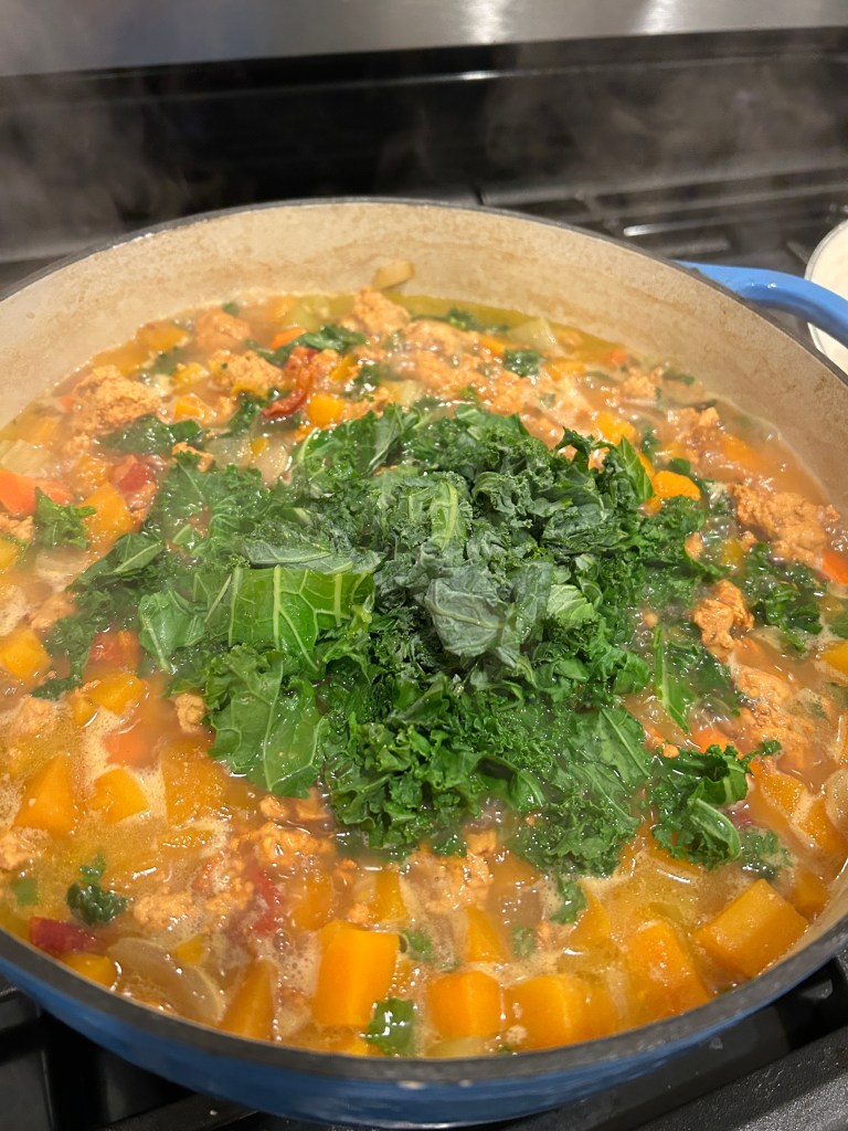 Add cooked ground turkey and chopped kale. After 5-10 minutes, it is ready to be served.