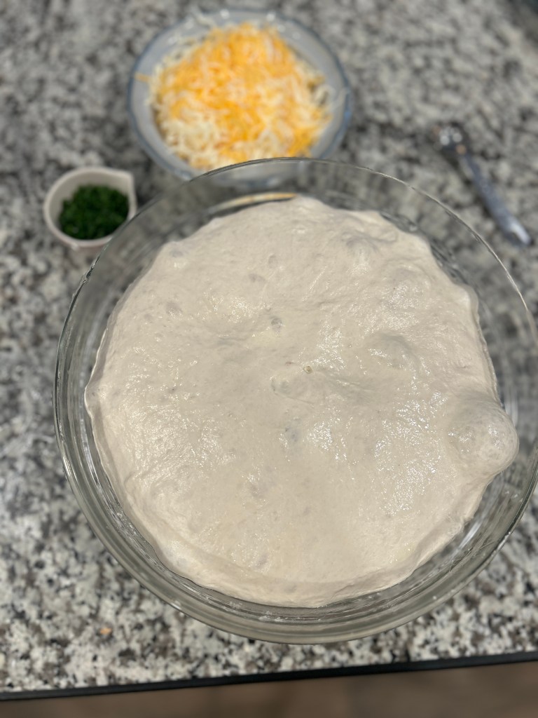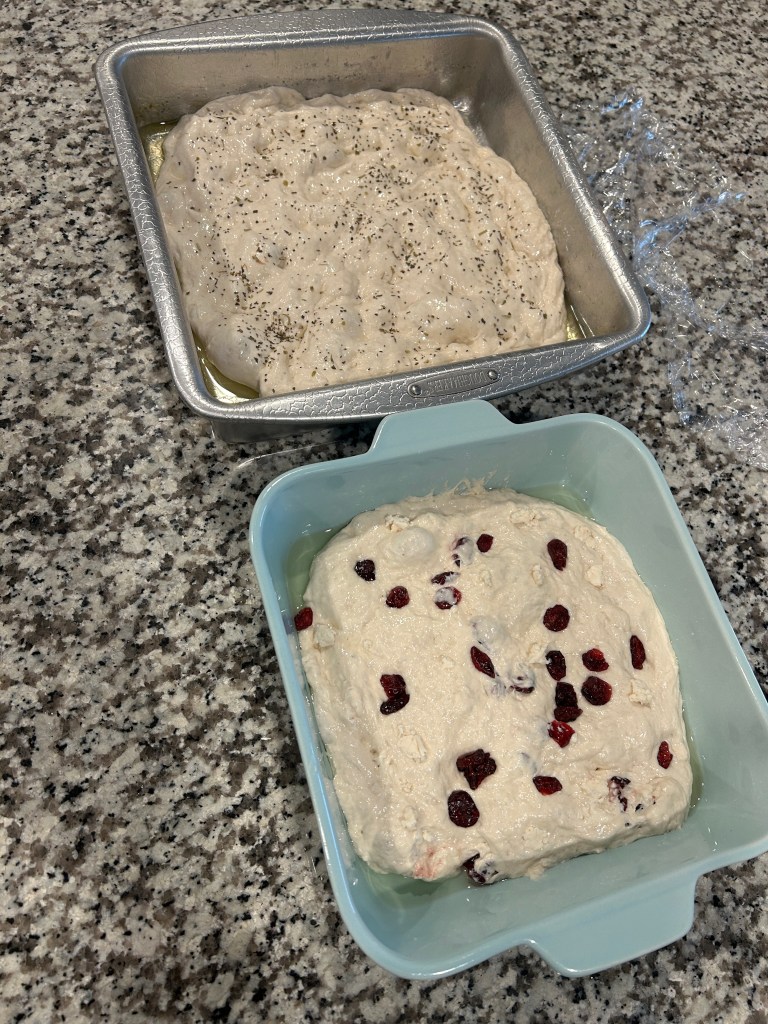 - Sourdough Focaccia: In preparation for giving my presentation at the county extension office on sourdough bread, I needed to brush up on my skills and talking points. I prepped my starter to make focaccia. I always follow the Clever Carrot’s recipe, but decided to try cheddar and chive inclusions using the chives from my garden. I had it in the oven, but the bread wasn’t quite done for me to take to the presentation. My mom and a close family friend came for a visit. I gave them a quick lesson on sourdough starter and made two variations of focaccia: Italian herb and craisin goat cheese. I love how easy focaccia is!